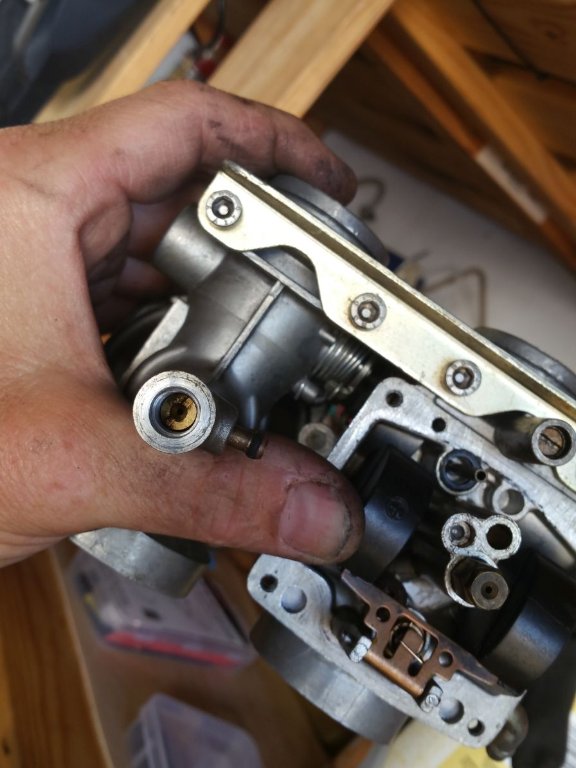 An diese Stelle gehört eigentlich KEINE Schlitzuschraube. Nach Abnehmen der Schwimmerkammer sieht man eine Sechskantschraube. Das ist die Hauptdüse, die ist einfach nur eingedreht.