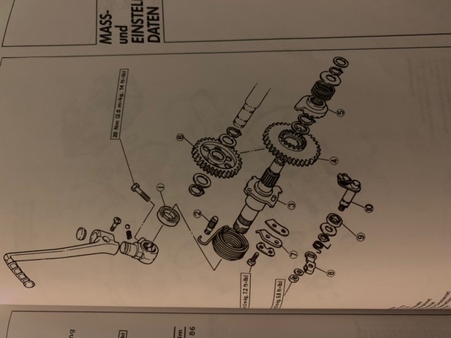 Es gibt aber keine Scheibe zum Weglassen, zumindest nicht auf der Zeichnung. Die Kickstarterwelle hat beidseits eine fixen "Anschlag" durch je einen Sicherungsring in einer Wellennut.