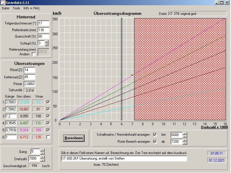 Anbei noch ein Bild der Getriebeübersetzung der originalen XT 600 3TB. Durch die Ritzel-Modifikation werden die Linien flacher, du erreichst also in jedem Gang eine etwas geringere Geschwindigkeit bei gleicher Drehzahl. Wie Du siehst, ist das Getriebe im Fünften bei einer Drehzahl von 7000 U/min bei knapp 165 km/h - die Du aber mangels Leistung nie erreichst. Danach ist sie bei 154 km/h, beschleunigt aber bessser.