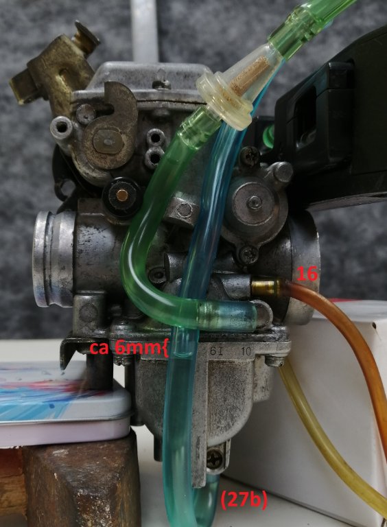 Ich habe jetzt mal ein Tourmax Vergaser Set verbaut mit neuem Nadelventil und Dichtungen und jetzt auch mit Sieb am Nadelventilsitz. Motor läuft jetzt, allerdings tritt ein neues Phänomen auf: Nach Einstellen des Schwimmerstands etc. funktioniert zunächst alles und der Motor läuft gut. Wenn ich die XT dann mit geschlossenen Hahn abstelle ist auch noch alles okay. Wenn ich dann später wiederkomme und den Benzinhahn wieder öffne, läuft es in einem durch aus dem unteren Abfluss (27b). Wenn ich einen Schlauch an den Abfluss hänge und höher halte, läuft der Vergaser noch weiter voll, bis er dann am höher gelegenen Abfluss (Schwimmerkammerbelüftung: 16) ausläuft. Das ganze läuft innerhalb von Sekunden über, d.h. ich vermute, dass das Nadelventil nicht schließt. Es kommt mir vor als würde der Schwimmer dem Druck aus dem Tank nicht genug entgegenwirken. Was ich bisher probiert habe: