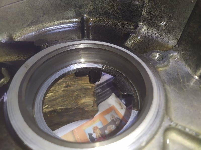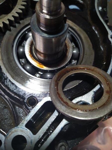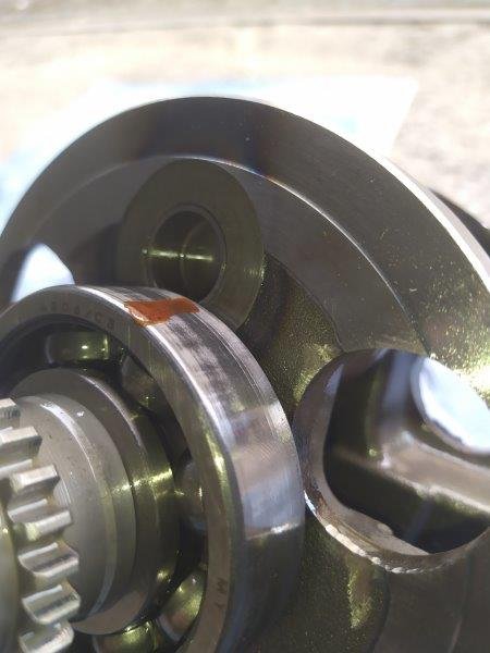 Passt ganz gut dahin und ich erinnere mich, das ganze damals mit Loctite 603 fügen Welle / Nabe eingeklebt zu haben, weil es da nämlich nix zu pressen gab... das Lager fiel auch eben einfach so raus... da press fittet gar nix... Könnte das mein Geräusch gewesen sein? Deswegen wurde es mehr, weil der Kleber weniger wurde? Man sieht auch, wie sich das Lager im Gehäuse verdreht hat, obwohl das Gehäuse fast besser aussieht als das Lager würde ich sagen.