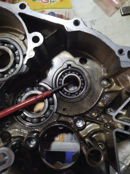 Die Kurbelwell hab ich übrigens mal versucht auf/ab zu ruckeln, rechts ging da gar nix, links ein wenig, schwer zu messen, ich würde sagen wenige Zehntel. Was da in was wackelt kann ich aber nicht wirklich sehen. Der Innenring der linken KW Lagers lässt sich auf jeden Fall auf der Welle leicht drehen, hat zum Ritzel ca 0,05mm Luft. Als die KW nur noch in der linken Hälfte steckte, konnte ich das rechte Wellenende ca. 3mm hin und her kippeln. Die Lager selber laufen alle top würde ich sagen. Nur eines ruckelt, nämlich jenes, auf das der Schraubendreher zeigt