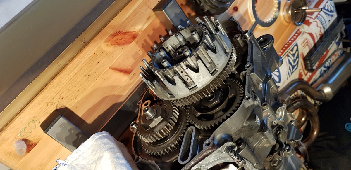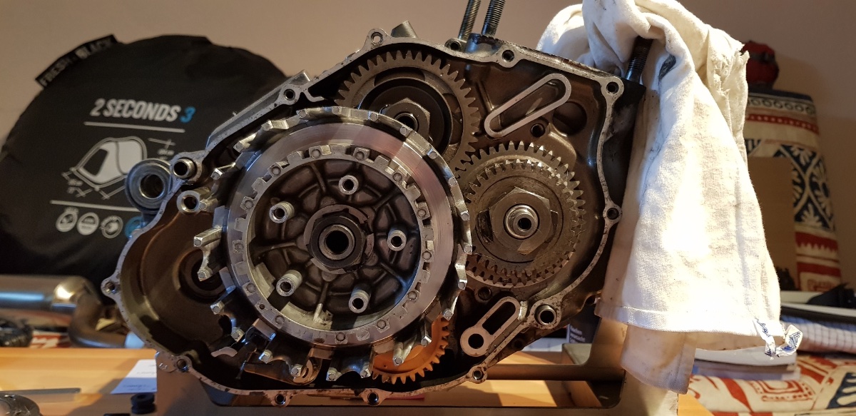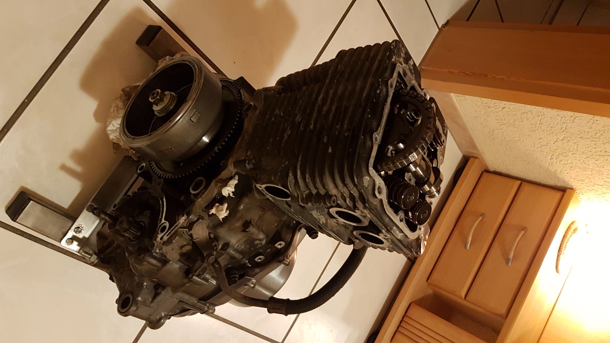 Nun zum Problem: Den Motor hatte ich damals zum Teil zerlegt, nämlich wie folgt: Zylinder und Kolben komplett raus, Steuerkette raus, Seitendeckel ab und Kupplung sowie diverse Zahnräder raus. So stand der Motor nun über die Jahre mehr oder weniger ungeschützt auf dem Montageständer in meinem Keller.