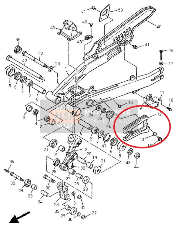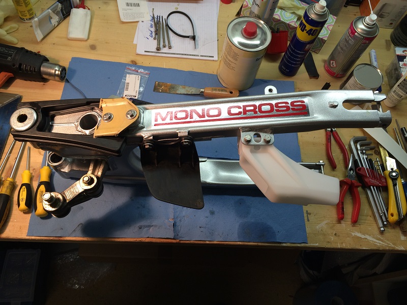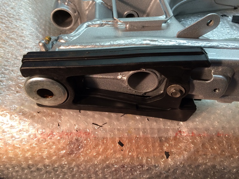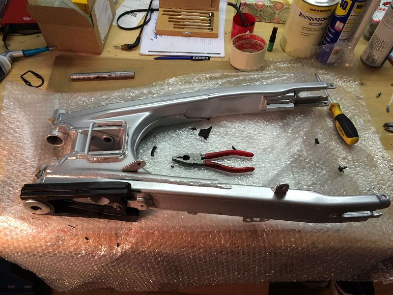 Leider muss dazu die Schwinge ausgebaut werden, da die alte Schwingenrolle raus muss. Den 3TB Schwingenschleifer muss man auch etwas bearbeiten, damit er über das aufgeschweißte Führungsblech der Laufrolle passt und in der Kettenflucht ist.