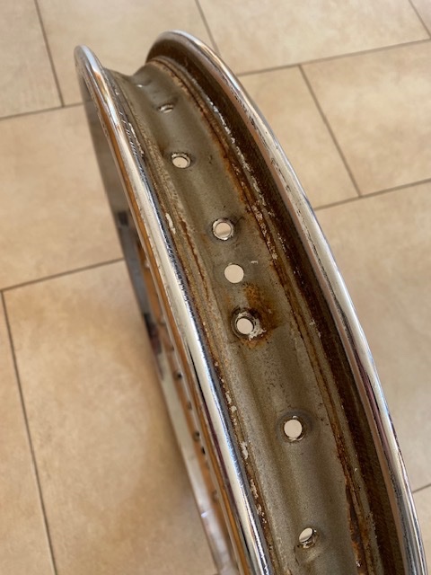 Dadurch wird Wasser durch die Speichenlöcher geschossen und sammelt sich unter dem Schlauchschutz und rostet. Entrosten und mit Hamerit Rostschutzfarbe streichen. Schützt ne Zeit lang.