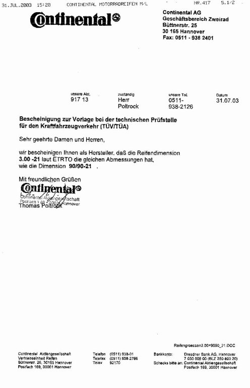 ja, nimm auch die Herstellerbescheinigung von Heidenau mit, dann sollte die TÜV Bescheinigung für die 130er Größe, wie bei mir, kein Problem sein. Bei Bedarf kann ich auch gerne eine Kopie meiner Bescheinigung zur Verfügung stellen.