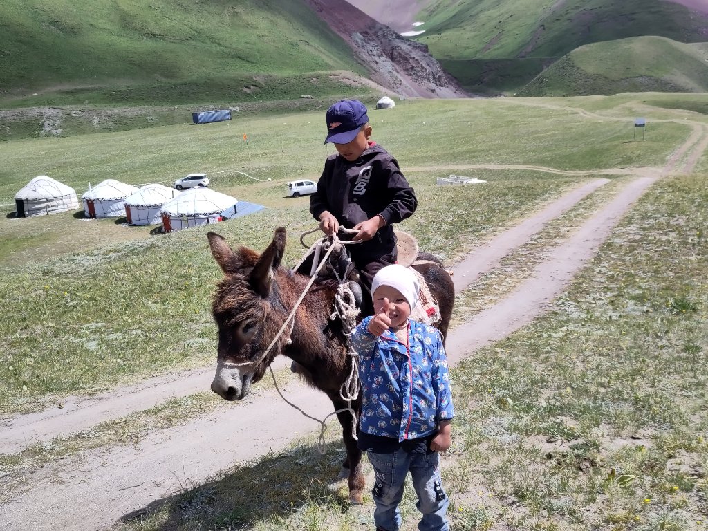 Über drei Ecken werde ich von einer jungen kirgisischen Touriführerin vermittelt und stolper in ein Homestay an der tadschikischen Grenze, nahe Batken, wo ich umsonst schlafen und speisen kann. Ganz umsonst nicht: ich soll Bilder machen für eine Plattform. Ich bin nämlich offenbar Profifotograf und soll hier das ganze Dokumentieren. Hahaha.... Ich glaube mein Schwindel ist schnell entdeckt, dennoch werde ich liebevoll beherbergt und tausche für eine Stunde das eiserne gegen ein fleischliches Pferd. Nach einer Stunde kennt mich das ganze Dorf ("schaut, ein Fotograf aus Deutschland, der kam mit dem Motorrad um unser Geschäft anzukurbeln.... Oooh...").