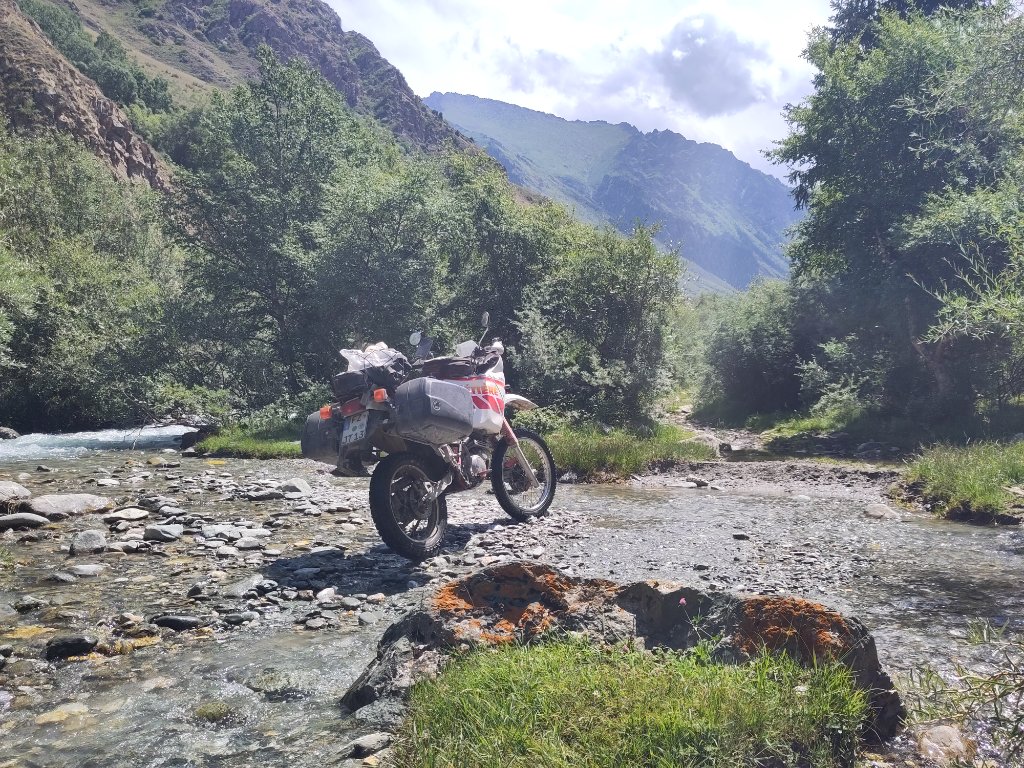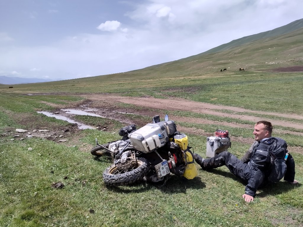 Über den Tosor Pass Richtung Yssyk Kul, Hagen ruht sich ein wenig an einem Schlammloch aus und hat noch Tage lang Probleme am Knie, und ich rassel fast eine Klippe runter - wieder ein Blinker kaputt, neue Kratzer an der Verkleidung. Hat niemand gesagt, dass die Maschinen am Ende so aussehen wie am Anfang...