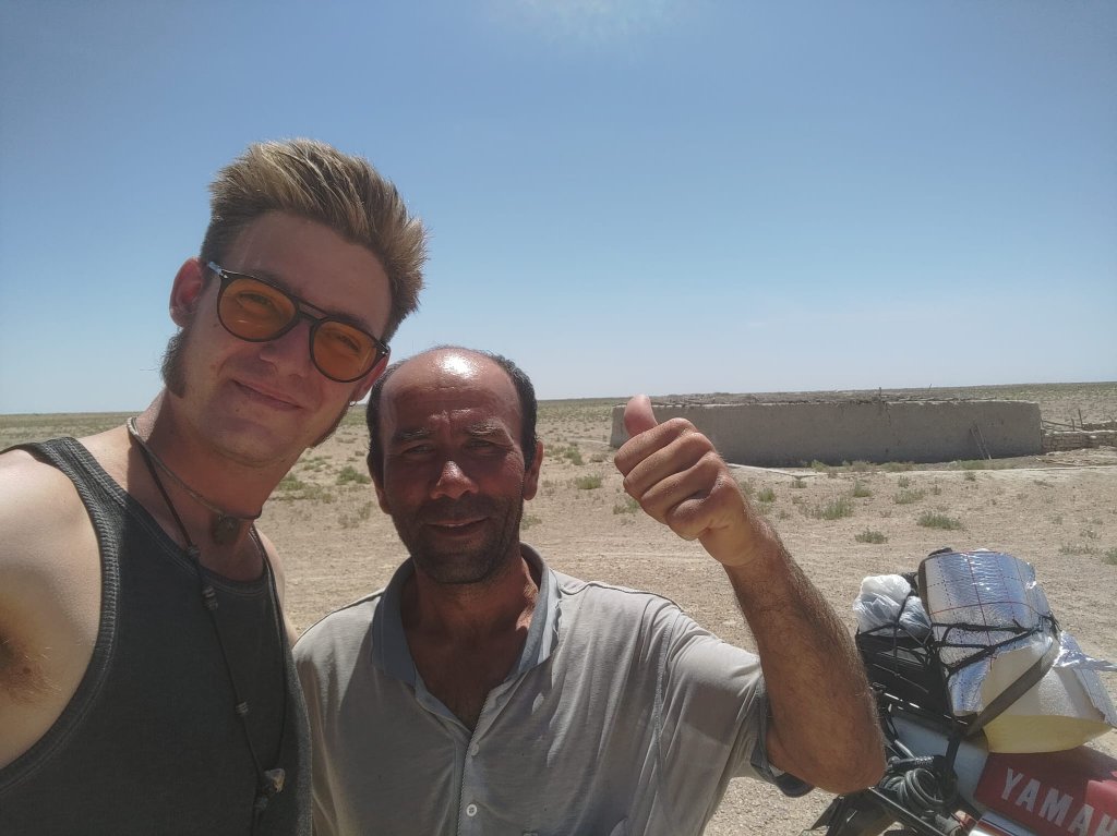 Der Übergang geht fix, in anderthalb Stunden sind wir drüben. Die darauf folgende Straße, eine Hauptverkehrsader quer durch Usbekistan, wichtige Transitstraße zwischen dem Ländern, ist in ganz überragend schlechtem Zustand - wirklich, wirklich ganz schlimm, sodass man oft lieber durch Sand und Geröll fährt als auf der strase. 400 km durch Nichts, keine Tankstelle, nur ein Kiosk in mitten der Wüste, Chai. Weiter durch den Staub bei 42°C bis Kungirod in der autonomen Region Karakalpakstan.