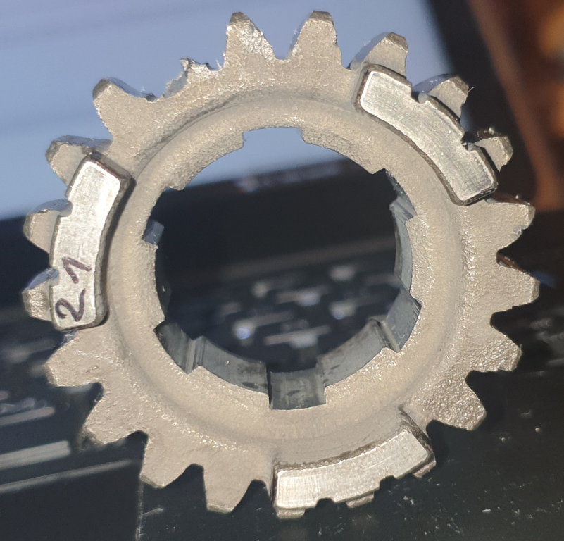 Neben Dichtungsmasse (unter anderem sowas wie Hylomar blau, feste Krümel, womit lässt sich das auflösen?) habe ich den abgebrochenen Zahn und Metallflitter gefunden.