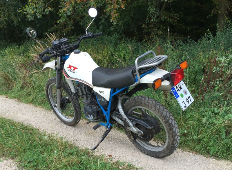 Die XT550 ging uns als "Beifang" ins Netz, als ich mit meinem Sohn (gerade 18 geworden) auf der Suche nach einer Enduro für ihn unterwegs war. Junior wollte eine moderne KTM EXC und ich wollte ihm mal zeigen, was es 30 Jahre vorher so gab und das schmackhaft machen. Wir waren dann zum Anschauen und haben das Objekt (4 Jahre abgemeldet und nicht gefahren, als "Umbaubasis zum Scrambler oder so" angeboten - grusel -, mit reichlich Patina und sprang auf den zweiten Tritt gleich an) - sofort eingetütet.