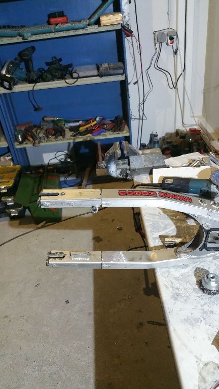 Ich habe die Schwinge um 10cm verlängert und vorne Götz Gabelverlängerungen montiert. Damit wird die Gabel 7cm länger.
