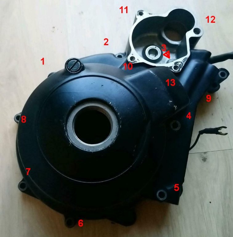Anmerkung: da dieses Gewinde oft überstrapaziert wird, hier der Reparatur-Tipp: M6er Helicoil-Einsatz montieren (dazu Kupplungsdeckel zwingend abnehmen, da sonst Späne in den Ölkreislauf dringen (kein Sackloch!)