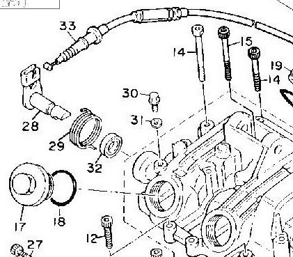 Nach dem Entfernen der Schraube und wenn der Dekohebel unbelastet ist, kann die Welle nach außen herausgezogen werden. Die Schraube (30) hat die Xamaha-Teilenummer 90109-06418-00 und einen Kupferdichtring (31) unterhalb!