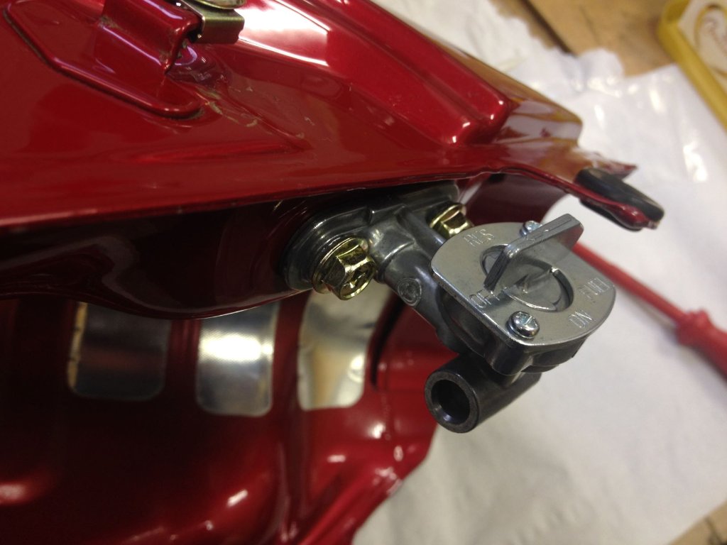Der Benzinhahn ist mit zwei Standard M6-Schrauben im Tank befestigt. Die originalen Kreuzschlitzschrauben vernudeln gerne und lassen sich schwer ordentlich festziehen, können aber durch Sechskant- oder Innensechskantkopfschrauben ersetzt werden.
