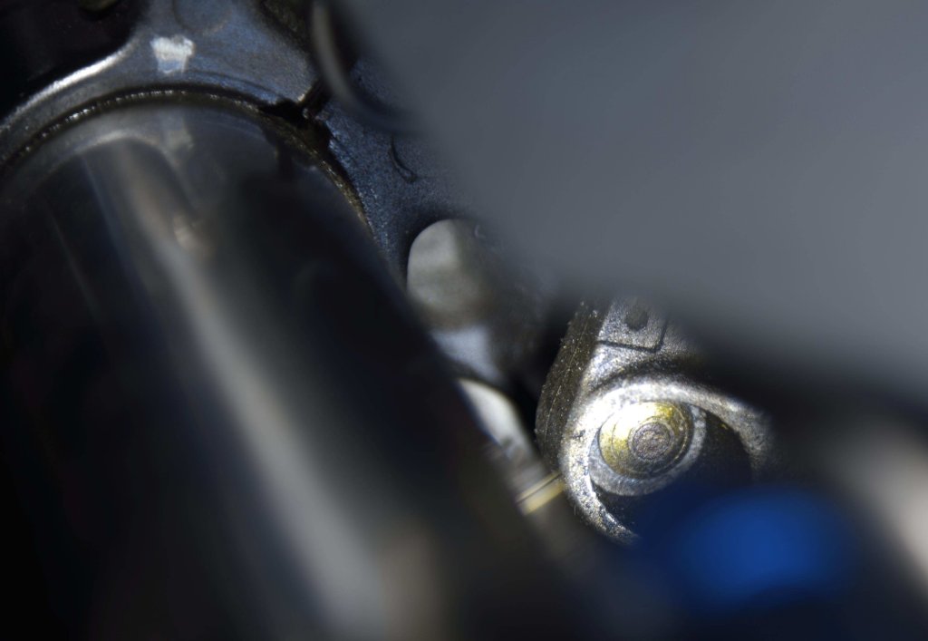 Ich sehe (von unten betrachtet, nah am rechten Gabelrohr) in einer Vertiefung "so etwas wie eine Schraube", die aber keinen Kopf zum anziehen hat.