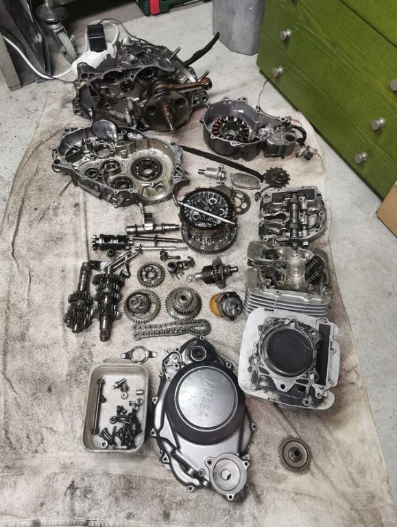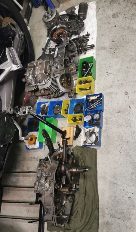 eine SRX mit E Starter (anstatt nur Kick) gab es nur im Modell 3SX, welches es aber nie offiziell in D zu kaufen gab. Nur ganz wenige (<80) schafften es nach D in den Jahren 1990-1993. Die SRX 600 von 1986-1989 gab es nur mit Kickstarter. Dennoch ist es mit etwas Extraaufwand möglich, einen 3TB Motor in der SRX 600 zu verwenden. Das größte zu lösende Problem ist dabei die Kettenführung passend hinzubekommen, da die Achse der neueren Motoren ca. 15mm weiter links herausschaut. Außerdem passt der Öltank nicht mehr zusammen mit dem Anlasser in den Zwischenraum. Entweder passt man den Tank an (um schweißen) oder verlegt den ganz. M.W.n. gibt es etwa 3 solcher Umbauten in D. Einen davon will ich hier kurz vorstellen.