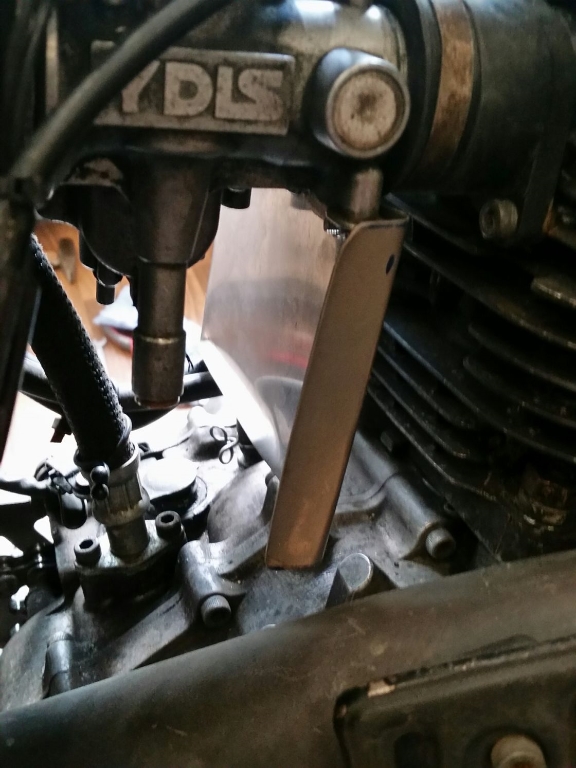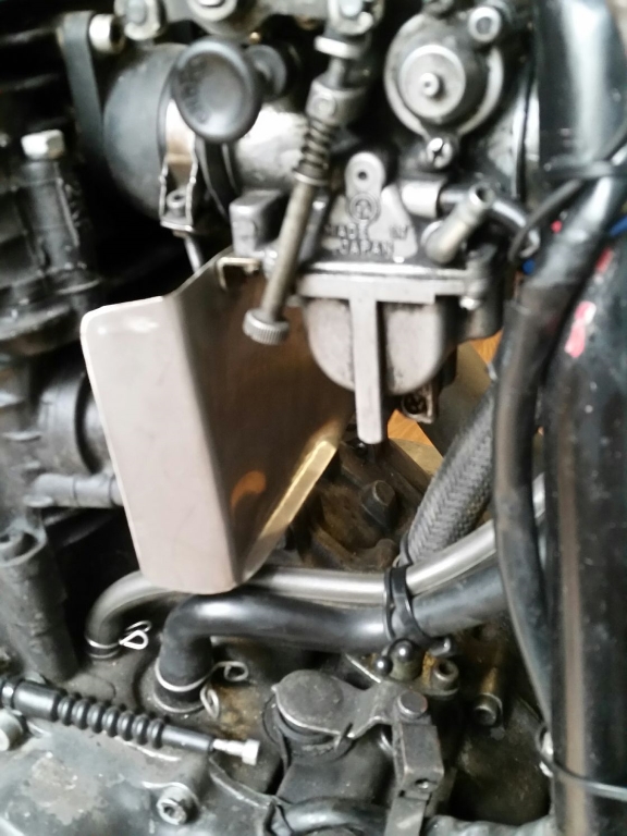 Hier noch Bilders. Also Vergaser raus, 2 Bohrlöcher (3/4mm) in die kleine Winkelverbindungsstrebe und Blech dann dran friemeln.