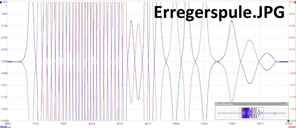 Diese Messwerte sind für mich auch plausibel. Die Peak-Spannungen sind leider abgeschnitten, da das Oszi nur max. 20V verträgt aber immerhin wird in der neu gewickelten Erregerspule mehr als 20V Spannung induziert. Das sollte auch ausreichend sein.