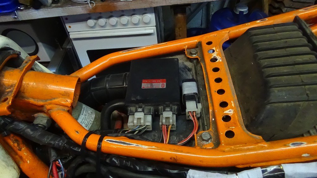 Der Rahmen der 43F, der ich gerade einen 3UW-E-Startermotor implantiert hab, ist in KTM-Orange lackiert. Auch eine sehr nette Farbe für eine XT600.