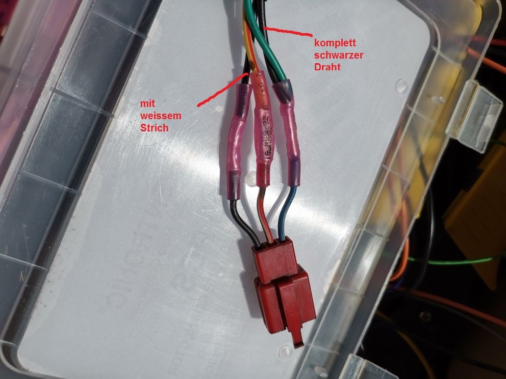 Der Draht vom Original Stecker in der Mitte ist bei mir auf dem Bild etwas unklar, aber sicher mit Gelb/Rot zu verbinden.