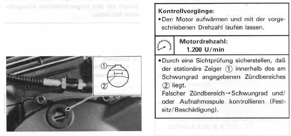 - Aber die beiden anderen Symbole müssten doch Kontrollmarkierungen für die Zündung sein (Spät und Früh), oder verstehe ich das falsch? Und damit diese Kontrollzeichen auch genutzt werden können, muß der Motor doch laufen, sonst klappt das nicht mit der Strobolampe. Ich kann mir nicht vorstellen, daß beim Überprüfen aus einem Guckloch etwas herausspritzen soll?