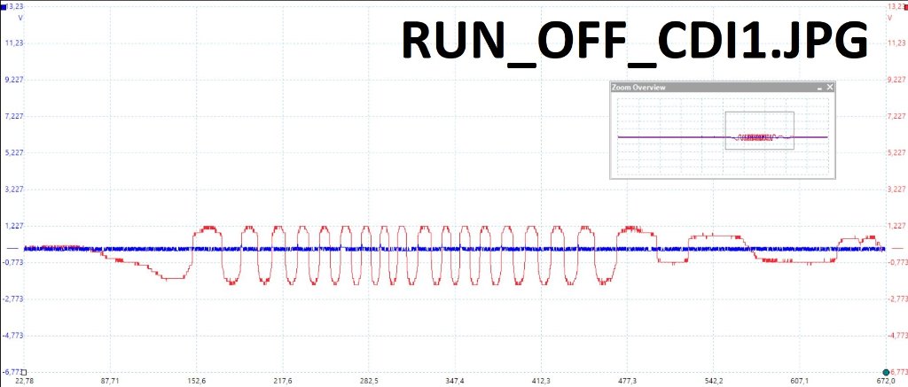 Hier sieht man den Verlauf von Orange und Rot/Braun, wenn der RUN-Schalter auf OFF steht. Hier kann man sehen, dass die Abschaltung der CDI funktioniert und über das orangene Kabel kein Spannungsimpuls Richtung Zündspule geht: