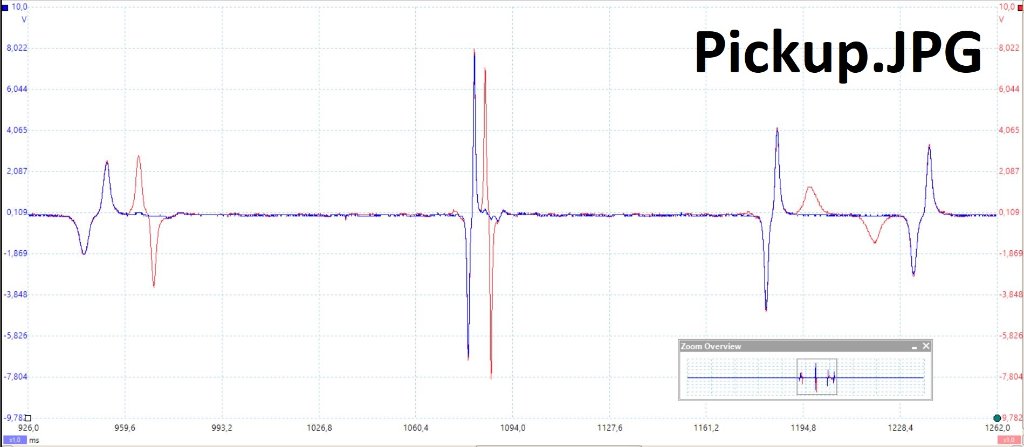 Ich bin mir ziemlich sicher (aber nicht 100%ig, dafür ists schon zu lange her) dass das erste Pickupsignal verkehrt herum kommt, also kabelmäßig verpolt ist. Es läuft normalerweise der positive Impuls zuerst ein.