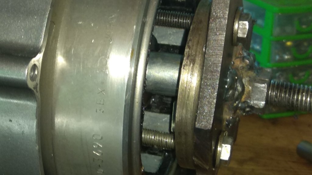 Gestern hab ich mir auf die alte ST37 Platte die M14er Mutter geschweißt (das hält), die runde 12 mm dicke Scheibe zusätzlich zur Vermeidung von Durchbiegung nach innen, eine Buchse gefertigt (ca.4..5mm Materialstärke), um auf dem Kurbelwellenstumpf abzustützen - drei M8 Schrauben ich meine 90mm lang. Ordentlich Rostlöser in die Nut, Motor dafür die Nacht über so hingelegt, dass Öl auch kriechen kann. Mit Heißluftföhn erwärmt, so dass das Kunststoff von den Magneten schon angeschmolzen ist. Schlagschrauber danach Verlängerungen ca. 1.5m.