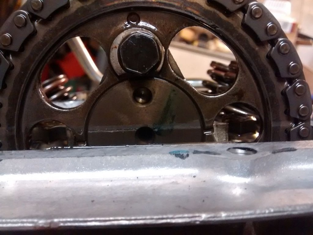 Die Steuerzeiten waren/sind auch etwas daneben, so wie im ersten Bild waren sie, ich hab die Nockenwelle jetzt einen Zahn nach hinten versetzt (Sieht zwar auf dem Bild nicht so aus, aber jetzt ist die Markierung nur noch halb so weit von der Planfläche weg als vorher, nur halt auf der anderen Seite) Das hat auf jedenfall eine deutliche Verbesserung gebracht, jetzt dreht sie viel williger aus als vorher (Hab jetzt auch zum ersten mal das rote REV Lamperl leuchten sehen, vorher wollte sie garnicht so hoch drehen)