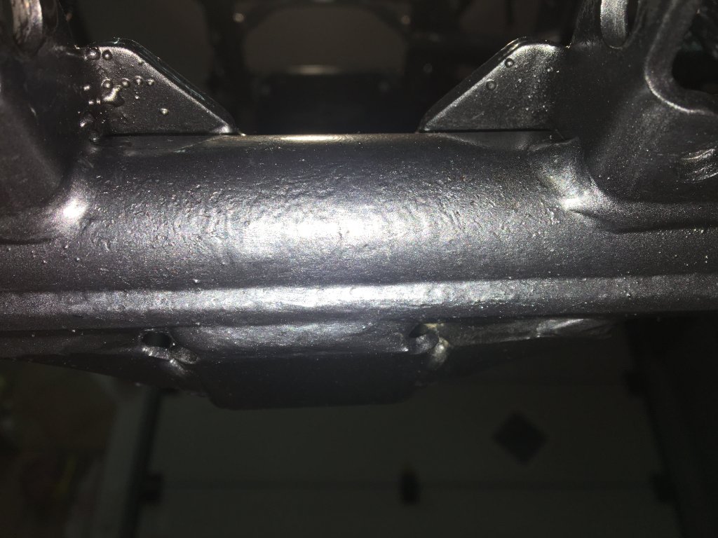 Diese Stelle auf der Unterseite war eigentlich in der Mitte blank (wie sandgestrahlt, schätze hier ist wohl viel Zeugs draufgeflogen), sieht jetzt so aus: