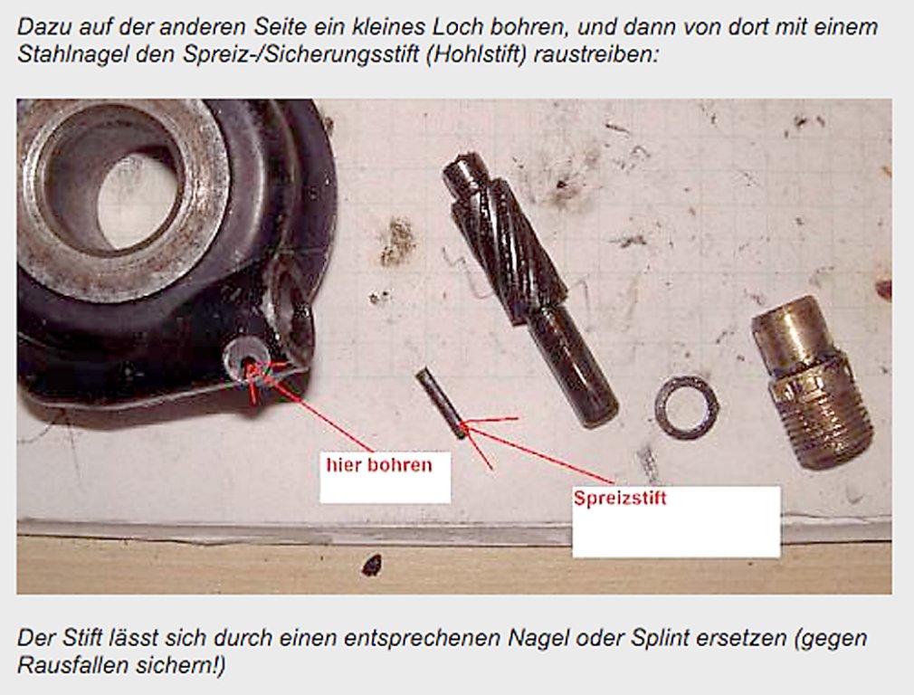 Ich hab es wie gesagt von der Rückseite gemacht. Ist aber ein schwierige Sache. Möglicherweise kannst Du mit einen ganz dünnen Bohrer innen durch den Spannstift durchbohren, so dass eine Führung entsteht. Diese dann erweitern auf den Durchmesser des Stiftes, damit Du mit dem Splinttreiber einen Ansatz hast. Im schlechten Fall gerät ein zu kleiner Splinttreiber IN den Stift und spreizt ihn. Viel Erfolg jedenfalls