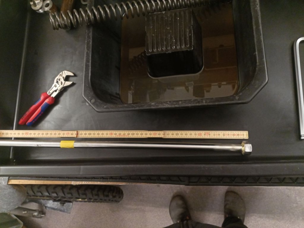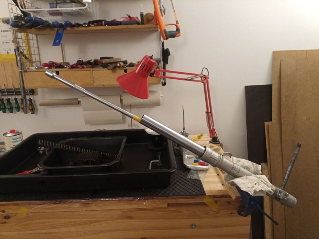 Bezüglich der Länge habe ich etwas übertrieben. Meine Verlängerung ist 750 mm lang. Das ist deutlich zu lang, ich habe auf den Bildern mit Klebeband markiert wie tief der Gegenhalter im Rohr verschwindet. Es scheint, dass eine Länge von 400 mm reicht.