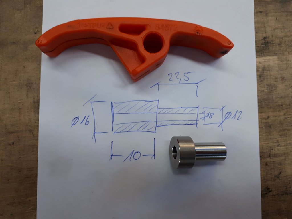 Also habe ich anstatt einer Distanzbuchse gleich einen kompletten neuen Bolzen gedreht. Der hat auch den Vorteil das die Gleitschiene beweglich montiert ist. Und da heute so schön die Sonne schien gleich eine Probefahrt gemacht. Keine Kettengeräuse mehr