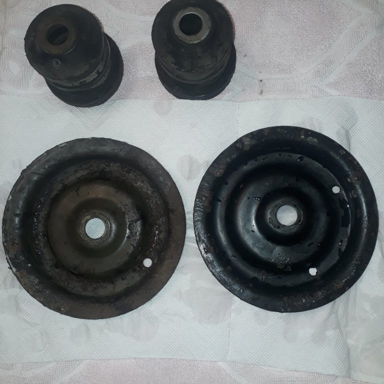 Beim Versuch, die oberen Federteller der Federbeine aufzuarbeiten, hab ich zu meiner Verwunderung unter der abgekratzten Bitumen-Masse zwei verschiedene Federteller vorgefunden.