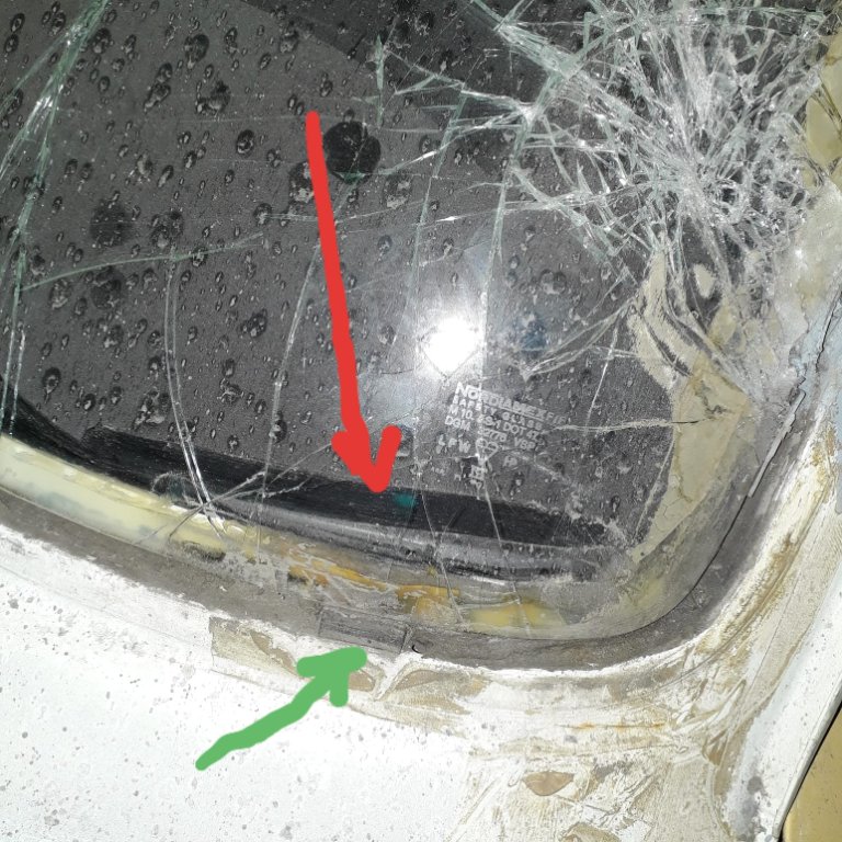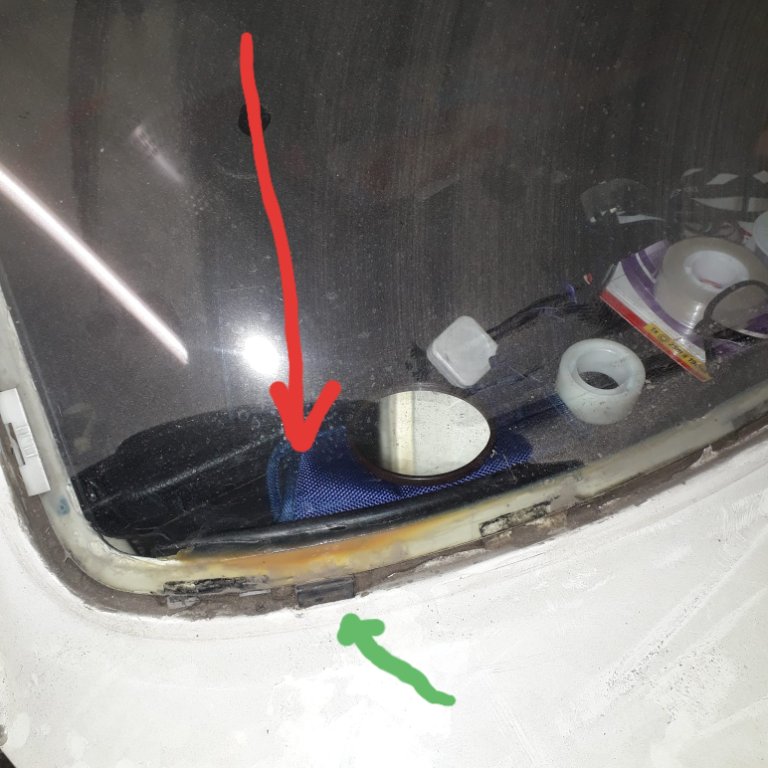Die Ursache für den Rost war wohl der Umstand, daß die Guten nach dem einkleben der Scheibe die Gummi-Distanzhalter (grüne Pfeile) nach dem Trocknen des Klebers nicht wieder weggeben haben und damit die Ablauflöcher von einer Seite blockiert waren.
