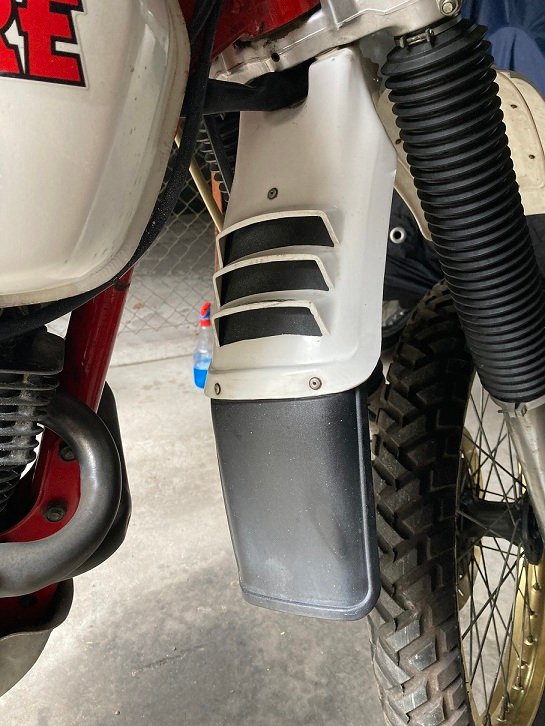 Die 34L ist abgebildet: BJ 84 und 39.000 km. Nun zur Frage: Sie hat am vorderen Fender einen Gummischutz der innen sogar über die Lüftungsschlitze des Fenders geht s. Bild. Sie ist eigentlich im großen und ganzen Serie (bis auf Sitzbank, Faltenbalge und den zweiten Benzinhahn auf der rechten Seite)... aber das mit dem Gummilappen kann doch nicht Serie sein? Die Nieten sehen original aus, aber wieso klascht man die Lüftungsschlitze zu??