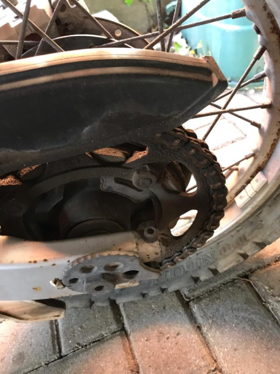 Kettensatz 130 wenn ich mir anschau wie rostig Hinterrad und Speichen sind. Vom Spanner her vermute ich dass da schon ein Glied rausgenommen wurde.