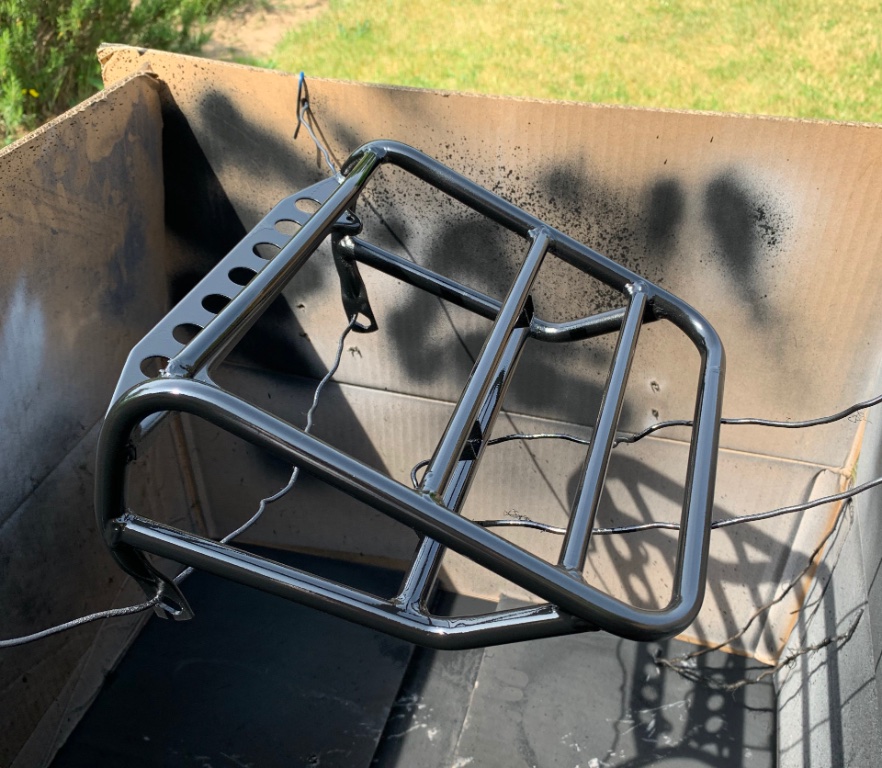 Der Gepäckträger ist entrostet und Garten-Klickerklackerdosen-lackiert.