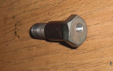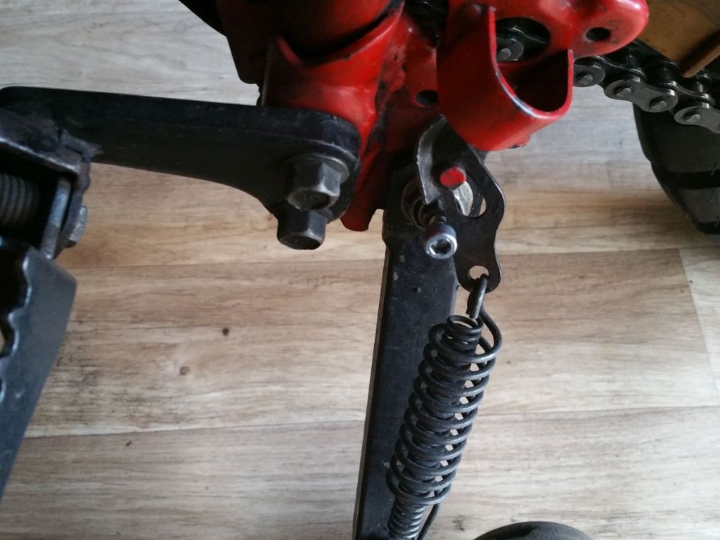 In die Originalschraube habe ich dazu eine kleine M6er Schraube eingesetzt, die das erledigt. Da ich ohne Klappmechanismus und Ständerschalter fahre - ich empfehle es keinem, der es nicht gewohnt ist! - kommt die Schraube zur HU rein.